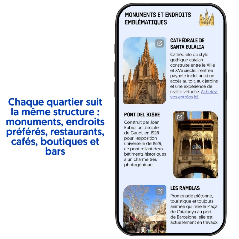 - L’ebook Barcelone quartier par quartier Toutes nos meilleures adresses classées par quartier : monuments, endroits préférés, restaurants, cafés, bars et boutiques. Chaque adresse a son lien Google Maps. Vous cliquez, vous y allez.