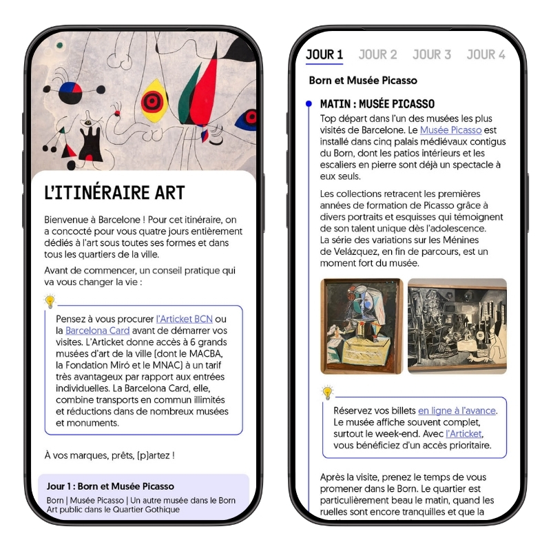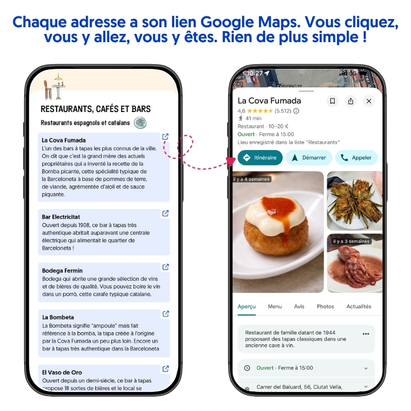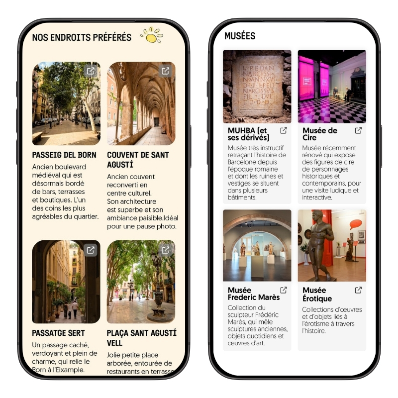 Nous avons rassemblé plus de 25 ans d’expérience et d’exploration de la ville dans un seul guide, conçu pour être utilisé directement sur votre téléphone. Il ne vous reste plus qu’à profiter du charme de Barcelone.
