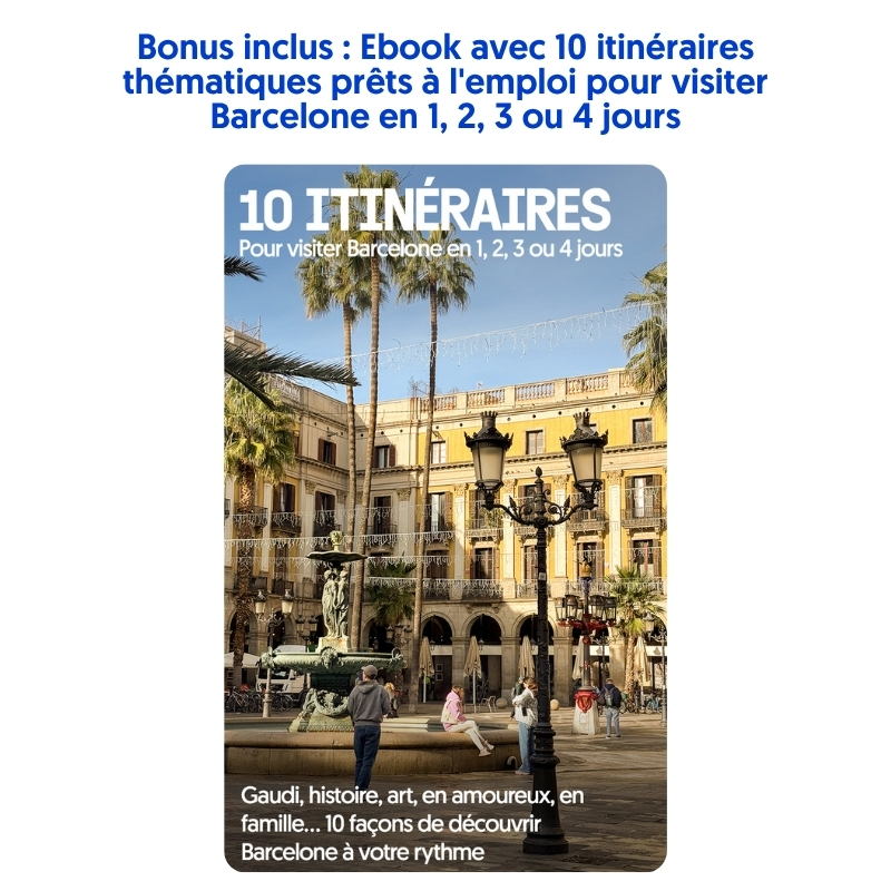 - L’ebook bonus : 10 itinéraires pour visiter Barcelone Gaudí, histoire, art, détente, en amoureux, en famille, shopping… 10 façons de découvrir la ville, avec un programme complet jour par jour. Vous choisissez celui qui vous ressemble, ou vous les combinez.