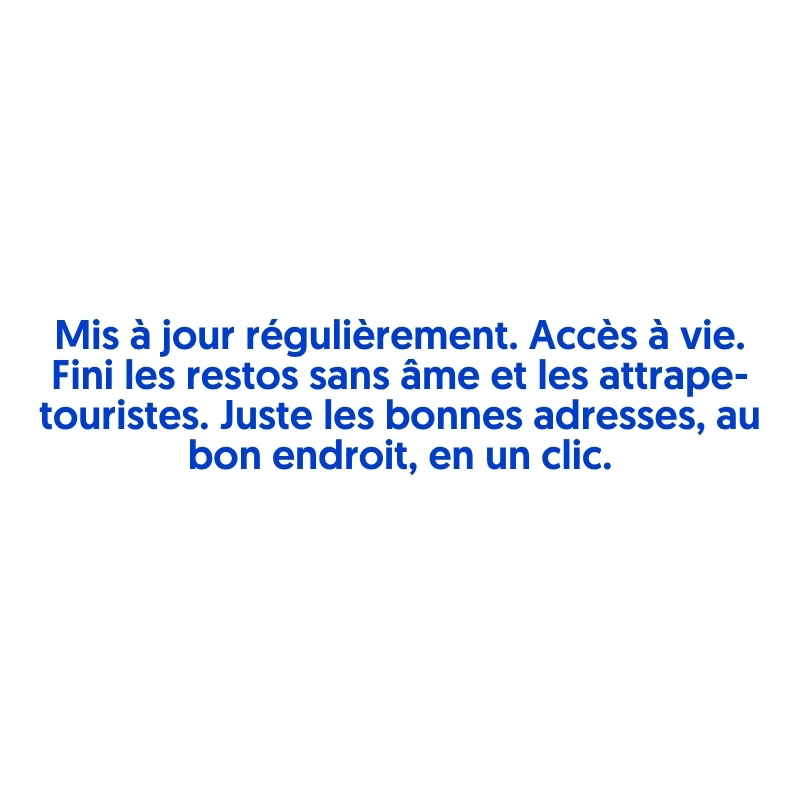 Nous mettons le guide à jour régulièrement. Nouvelles adresses, fermetures, changements… vous recevez automatiquement toutes les mises à jour, sans rien payer de plus.